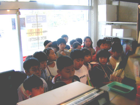 平成12年9月19日火曜日 わが東部小3年のみんながお店の見学に来てくれた。引率の伊藤先生はじめたくさんの子供達でお店に入りきれなかったけれど、みんなまじめにしつもんしてくれたよ。一番高い肉はどれですかとか、1日何人お客さんが来てくれるのかとか、鋭い質問にたじたじの暇な肉屋でした(~_~;)