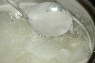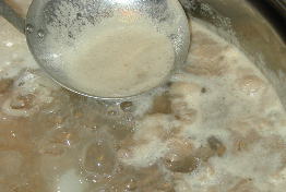2. 里芋が柔らかくなったらあく(あわ)が出ますので、丹念にすくい取ってください。 |