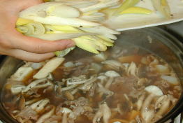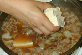6.一煮立ちしたら、豆腐を切り入れ茸をいれます。山形の方では豆腐は入れないんですって。米沢だけなんだ。でも、豆腐は最高旨いです。なんと言っても必要です!! |