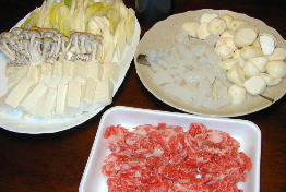 2. こんにゃくは味をしみ込ませ易くするため、食べやすい大きさに手でちぎります。 3. 茸は石突きを取り割いておきます。ネギは鍋物用に斜め切りです。 4. 米沢牛は2〜3pくらいに切りましょう。 |